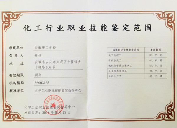 为实现我校化工技能鉴定与行业技能鉴定中心精准对接,我校技能鉴定站积极申报国家化工职业技能鉴定资格。日前,中国化工职业技能鉴定中心授予我校国家化工技能鉴定资格。该资格取得后,我校可进行化工总控工、有机合成工、无机化学反应生产工、工业废水处理工、涂料生产工等5个工种的初、中、高级鉴定工作。